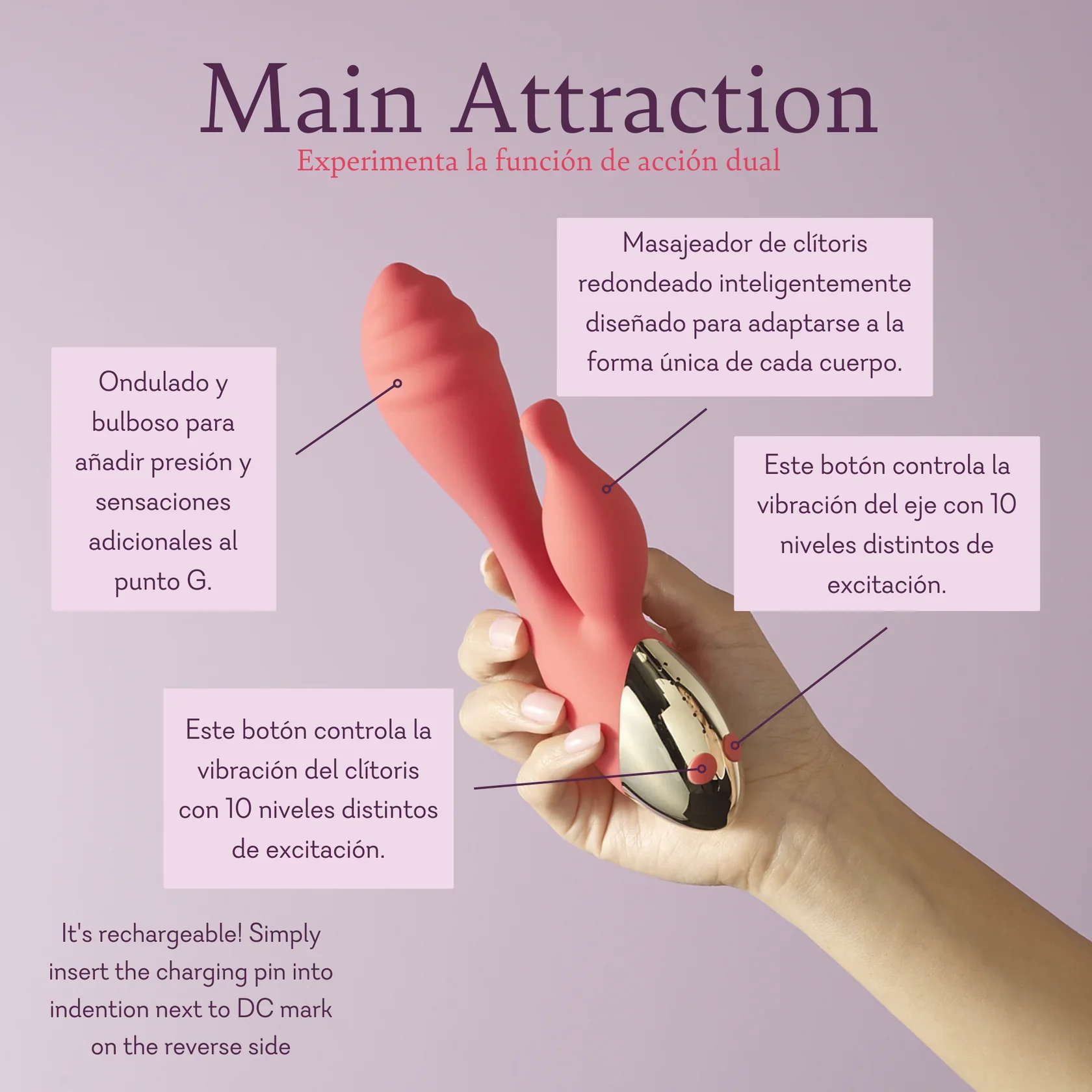 Su diseño recargable y resistente al agua te permite disfrutar de aventuras relajantes en la bañera, y su flexibilidad te asegura que cada rincón sea alcanzado. Con un tiempo de carga de solo 1,5 horas y un rendimiento de hasta 5,25 horas, siempre estarás lista para la diversión. Limpia fácilmente con nuestro Cleansing Mist y asegúrate de mantener tu juguete en perfectas condiciones.