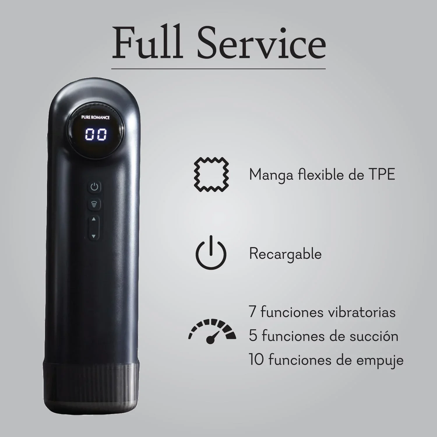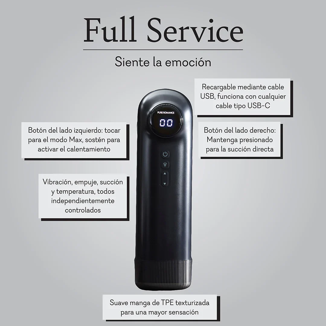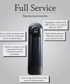 ¡Y no te preocupes! El “Full Service” está hecho de TPE suave, seguro y ecológico, que te garantiza una experiencia segura y placentera. Su diseño extraíble facilita la limpieza, porque sabemos que lo que importa es tu tranquilidad. Además, su compatibilidad USB-C significa que siempre estará listo para la acción después de cargarlo durante solo 2.5 horas.