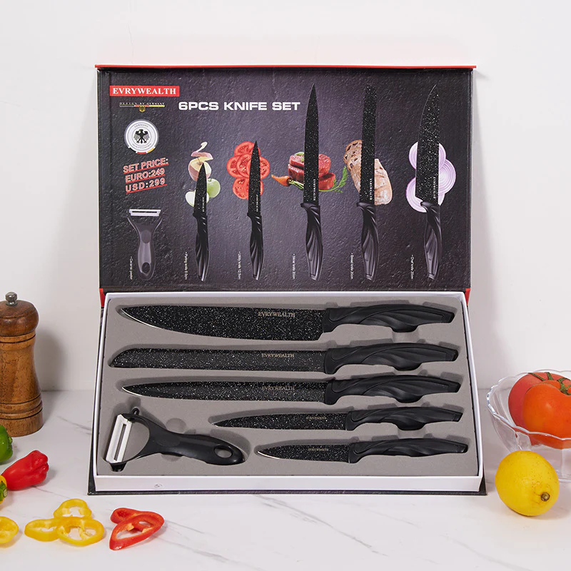 ¿Te preocupa la seguridad? No hay problema. Todos nuestros cuchillos han pasado rigurosas pruebas de calidad, asegurando que sean seguros para tu uso diario. El Juego de 6 Piezas incluye cuchillos para todo propósito: chef, pan, verduras, y más. ¡Prepárate para impresionar a tus amigos y familiares con tus habilidades culinarias!